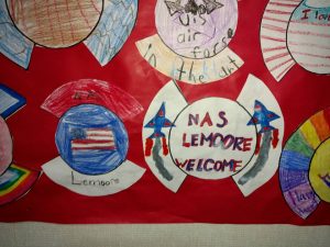 Patch designs at RJ Neutra Elementary at at NAS Lemoore, CA – inspired by patch template seen inside “Good Night Captain Mama” children’s book by veteran Graciela Tiscareno-Sato